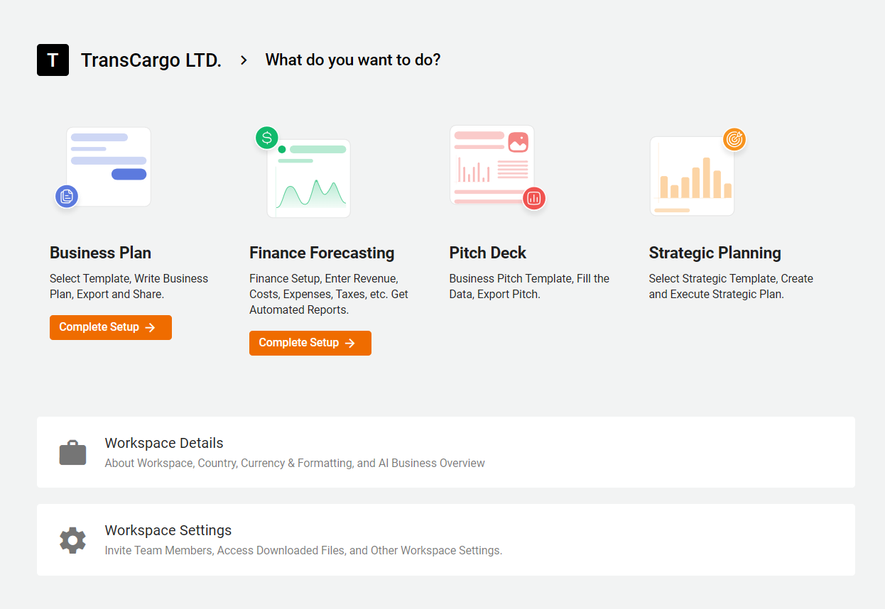 Once your Workspace is set up, move on to writing your Business Plan, Click here to start writing your Business Plan.