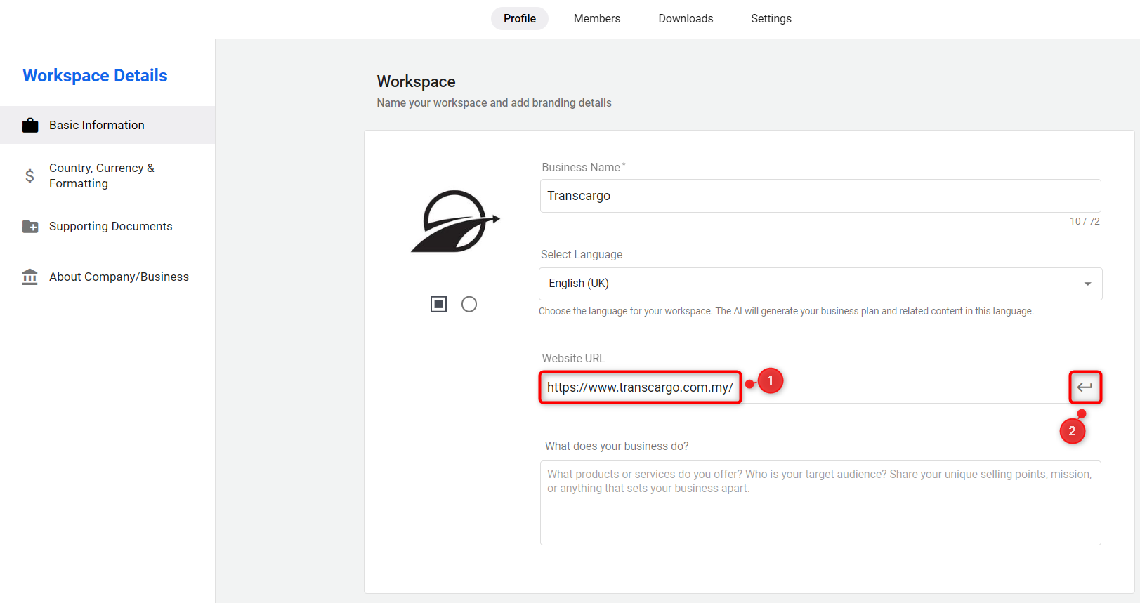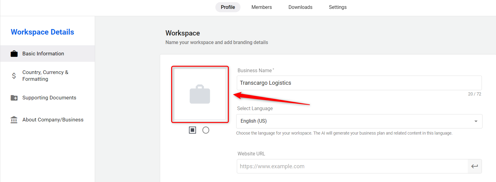 - Workspace Logo: In the Workspace section, upload your business logo.
