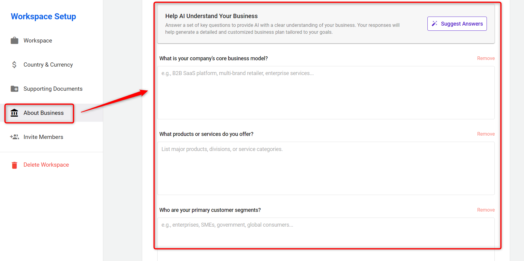 - Answer the AI-generated questions to share key insights about your business.