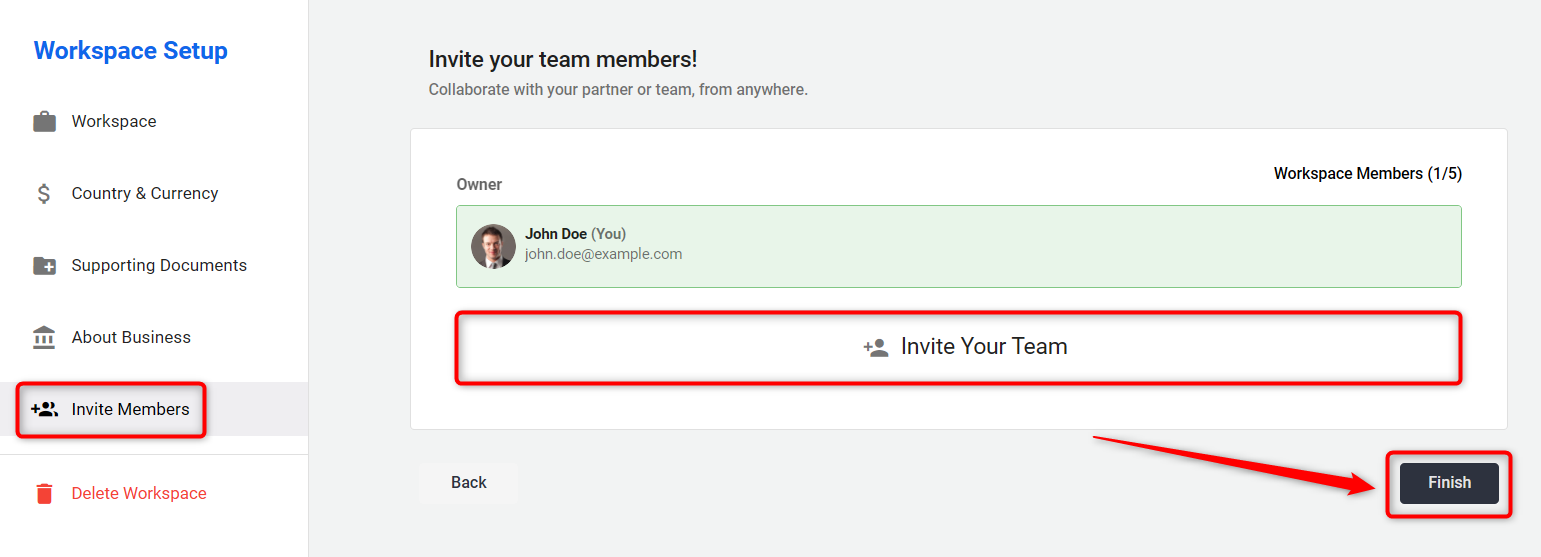 In the final step, under the Invite Members section, you can invite your teammates, colleagues, or business partners to collaborate within the workspace.